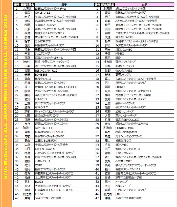 【参加チーム一覧】第57回マクドナルド全国ミニバスケットボール大会2026