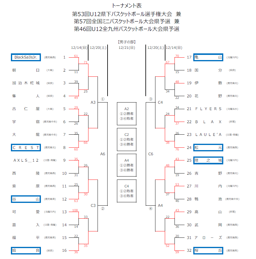 BSJ・CREST・谷山・姶良・亀山・松元・隈之城・桜丘の8チームがベスト8進出を果たしました。