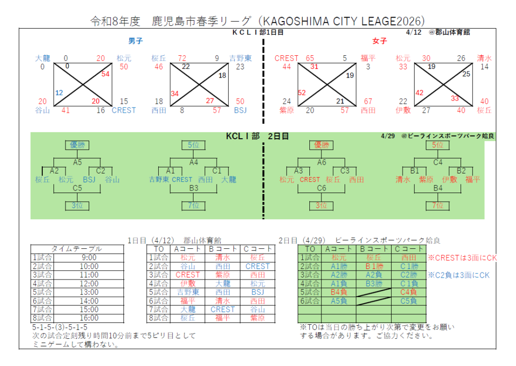 (1日目結果)鹿児島市リーグ戦(KAGOSHIMA CITY LEAGE2026)2026/4/12.29開催!!!